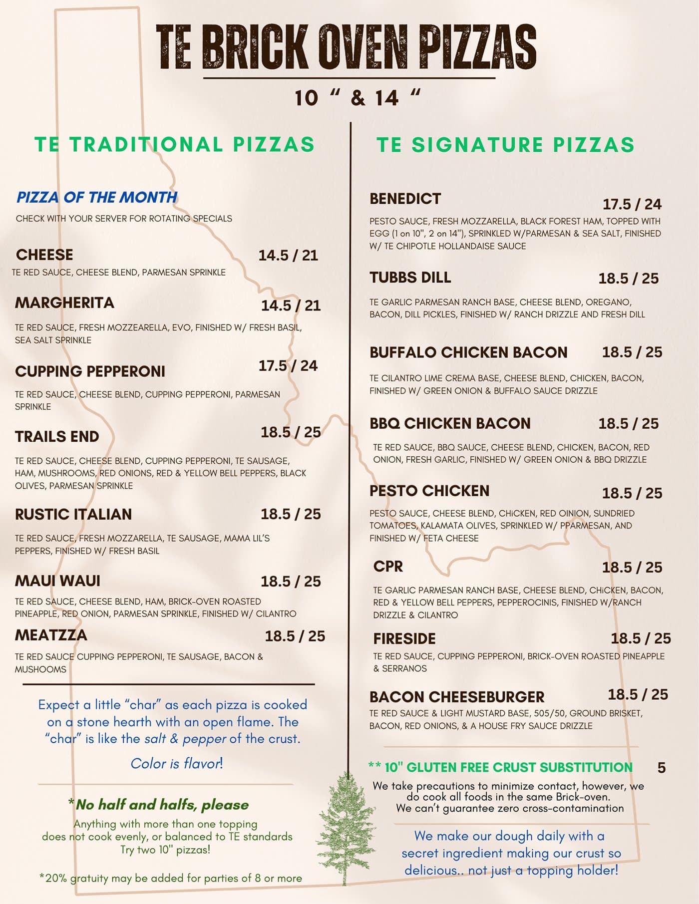 TE Garlic parmesan ranch BASE, cheese blend, chicken, bacon, red & yellow bell PEPPERS, pepperoncini’s, finished with ranch DRIZZLE & cilantro