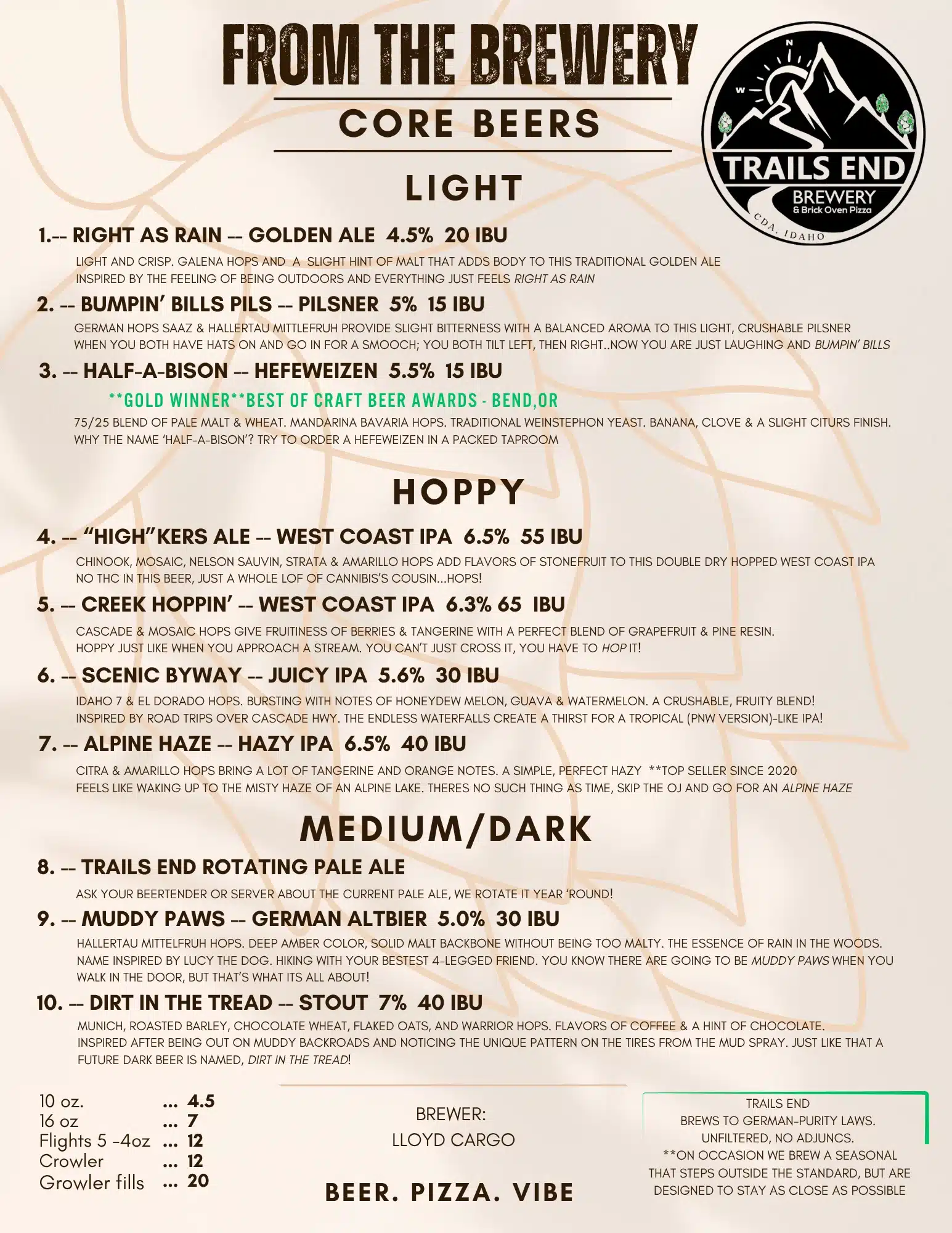 As one of the oldest food laws on record, the German Purity Laws of 1516 (Reinheitsgebot) intended to keep the integrity of beer intact at a time when anything and everything could be thrown into a beer. Nowadays, the laws serve as a reminder of what the four true ingredients of beer are: water, malted barley, hops and yeast. So why does this matter? At Trails End Brewing, you won’t find anything else but these four ingredients in our beers. We believe these laws are worth celebrating, and we strive to be consistently creative and innovative within the frameworks of these laws. Our beers are classically inspired, unfiltered, and as true to style as you will find outside of Germany.